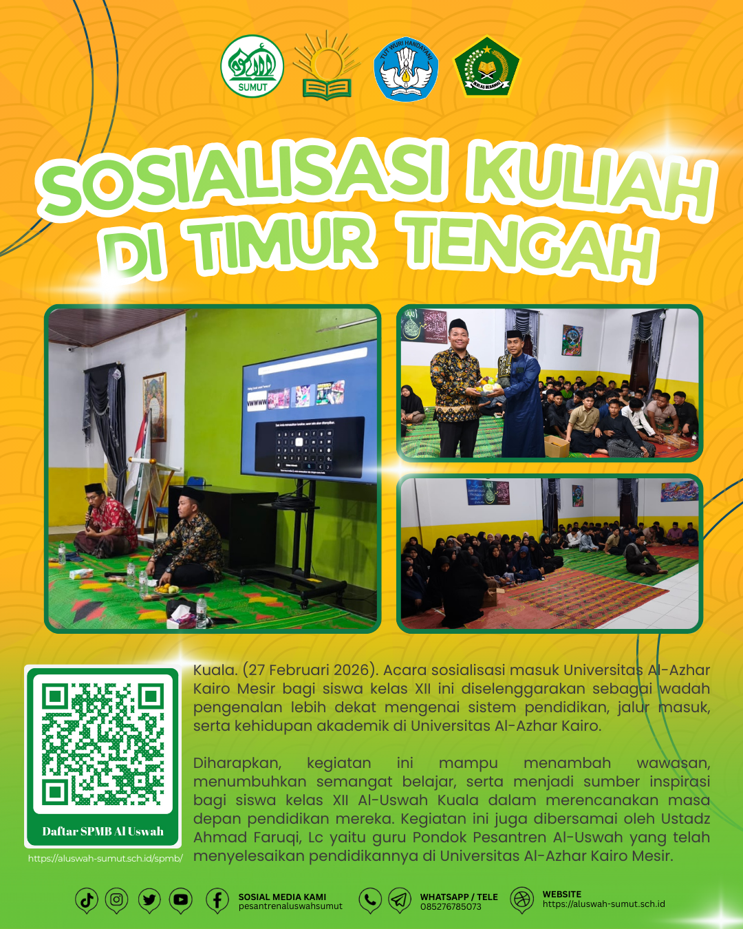 Acara sosialisasi masuk Universitas Al-Azhar Kairo Mesir bagi siswa kelas XII ini diselenggarakan sebagai wadah pengenalan lebih dekat mengenai sistem pendidikan, jalur masuk, serta kehidupan akademik di Universitas Al-Azhar Kairo. Melalui kegiatan sosialisasi ini yang dipaparkan oleh Lembaga Bimbingan dari Yayasan Islam An-Najah Centre Medan berbagi tips dan trik beserta pengalaman seputar proses pendaftaran, persiapan […]