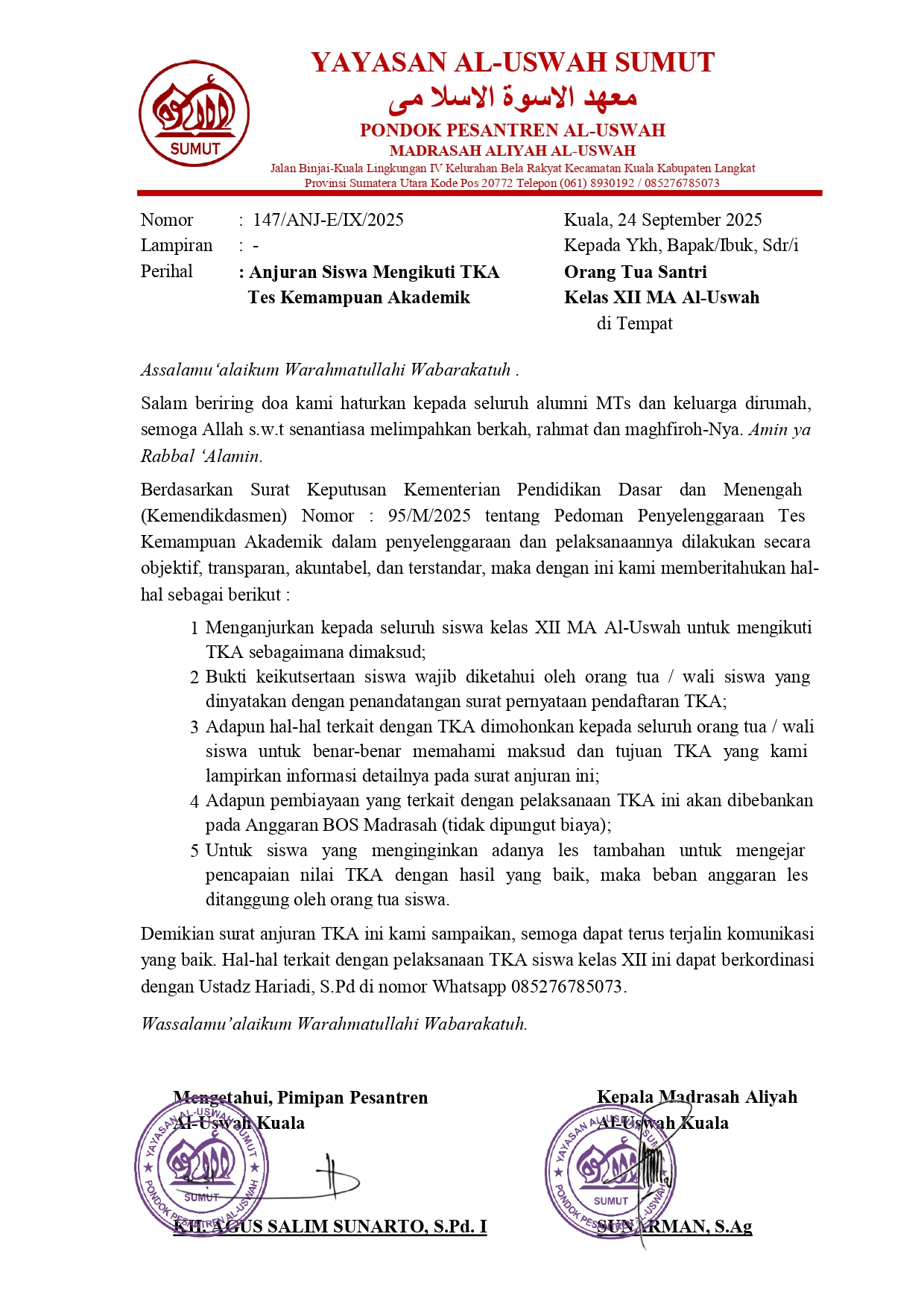 Berdasarkan Surat Keputusan Kementerian Pendidikan Dasar dan Menengah(Kemendikdasmen) Nomor : 95/M/2025 tentang Pedoman Penyelenggaraan TesKemampuan Akademik dalam penyelenggaraan dan pelaksanaannya dilakukan secaraobjektif, transparan, akuntabel, dan terstandar, maka dengan ini kami memberitahukan hal-hal sebagai berikut. Surat dapat didowload pada link dibawah ini. Silahkan unduh surat di link berikut ini : DOWNLOAD